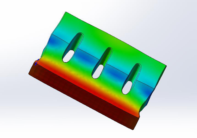 超聲波模具制作前,要用軟件專門頻率模擬測(cè)試,保證超聲波模具的發(fā)力跟頻率效果,下圖是15khz超聲波模具平模,尺寸280*45mm,超聲波模具頻率發(fā)力效果(見下圖)。